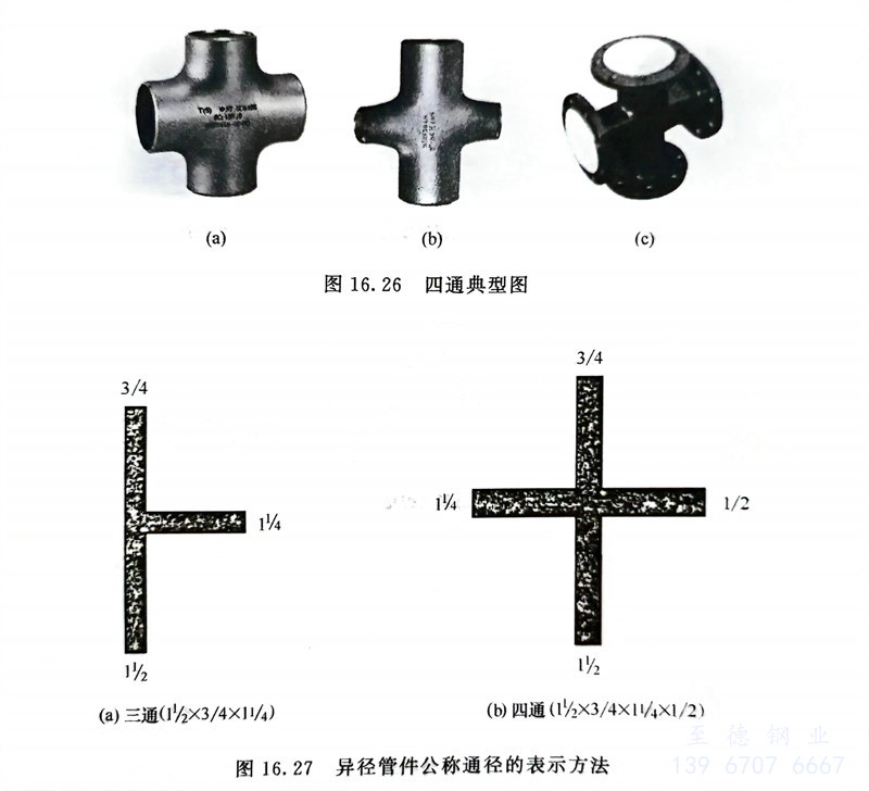 ⑤. 對(dui)于異徑(jing)(jing)(jing)三(san)通,首(shou)先(xian)給(gei)出(chu)(chu)最(zui)(zui)大(da)(da)(da)端(duan)(duan)的(de)(de)公(gong)稱(cheng)通徑(jing)(jing)(jing),然后是(shi)與(yu)(yu)最(zui)(zui)大(da)(da)(da)端(duan)(duan)相(xiang)對(dui)應的(de)(de)那一(yi)端(duan)(duan)的(de)(de)公(gong)稱(cheng)通徑(jing)(jing)(jing),最(zui)(zui)后給(gei)出(chu)(chu)支管端(duan)(duan)的(de)(de)公(gong)稱(cheng)通徑(jing)(jing)(jing);對(dui)于異徑(jing)(jing)(jing)四通,首(shou)先(xian)給(gei)出(chu)(chu)最(zui)(zui)大(da)(da)(da)端(duan)(duan)的(de)(de)公(gong)稱(cheng)通徑(jing)(jing)(jing),其(qi)次是(shi)與(yu)(yu)最(zui)(zui)大(da)(da)(da)端(duan)(duan)相(xiang)對(dui)應的(de)(de)另(ling)一(yi)端(duan)(duan)的(de)(de)公(gong)稱(cheng)通徑(jing)(jing)(jing),第(di)三(san)個給(gei)出(chu)(chu)的(de)(de)是(shi)另(ling)外兩端(duan)(duan)中較大(da)(da)(da)端(duan)(duan)的(de)(de)公(gong)稱(cheng)通徑(jing)(jing)(jing),最(zui)(zui)后給(gei)出(chu)(chu)剩(sheng)余一(yi)端(duan)(duan)的(de)(de)公(gong)稱(cheng)通徑(jing)(jing)(jing),見(jian)圖16.27。