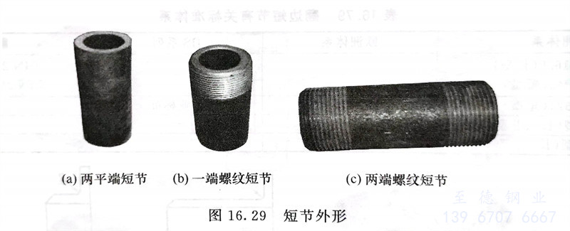 1. 短(duan)(duan)(duan)節(jie)是(shi)長(chang)度小(xiao)于12in(0.3m)、兩端或一端有(you)螺紋(wen)(wen)并便于進行焊(han)接(jie)(jie)(jie)(jie)或機械(xie)連接(jie)(jie)(jie)(jie)的(de)(de)(de)一段管(guan)(guan)(guan)子。當長(chang)度在(zai)12in(0.3m)以上時,則稱(cheng)為短(duan)(duan)(duan)管(guan)(guan)(guan)。普通類(lei)型的(de)(de)(de)短(duan)(duan)(duan)節(jie)是(shi)全(quan)外牙型,螺紋(wen)(wen)接(jie)(jie)(jie)(jie)口的(de)(de)(de)長(chang)度大約(yue)為標(biao)(biao)準(zhun)管(guan)(guan)(guan)螺紋(wen)(wen)的(de)(de)(de)2倍,且沒(mei)有(you)肩(jian)部。任何長(chang)度的(de)(de)(de)帶肩(jian)螺紋(wen)(wen)管(guan)(guan)(guan)接(jie)(jie)(jie)(jie)頭(tou)(tou)(tou)的(de)(de)(de)兩個管(guan)(guan)(guan)螺紋(wen)(wen)間有(you)肩(jian)部;短(duan)(duan)(duan)管(guan)(guan)(guan)螺紋(wen)(wen)管(guan)(guan)(guan)接(jie)(jie)(jie)(jie)頭(tou)(tou)(tou)是(shi)比(bi)全(quan)外牙型螺紋(wen)(wen)管(guan)(guan)(guan)接(jie)(jie)(jie)(jie)頭(tou)(tou)(tou)稍長(chang)的(de)(de)(de)帶肩(jian)螺紋(wen)(wen)管(guan)(guan)(guan)接(jie)(jie)(jie)(jie)頭(tou)(tou)(tou),且對于不(bu)同管(guan)(guan)(guan)徑的(de)(de)(de)管(guan)(guan)(guan)子的(de)(de)(de)特定長(chang)度均要符(fu)合制造商標(biao)(biao)準(zhun)。短(duan)(duan)(duan)節(jie)外形見圖(tu)16.29。