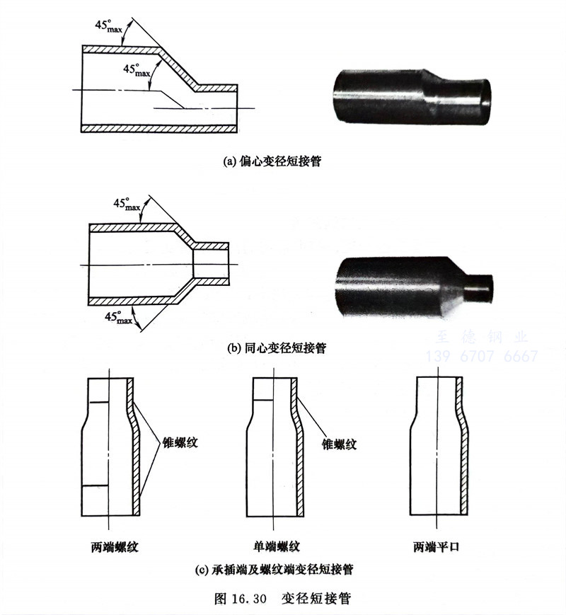 2. 變(bian)徑短接(jie)(jie)管(guan)(guan)(guan)(圖16.30)也稱異形短節、漸縮管(guan)(guan)(guan),與大小頭(異徑管(guan)(guan)(guan))相同,用以(yi)減小管(guan)(guan)(guan)線口徑。變(bian)徑短接(jie)(jie)管(guan)(guan)(guan)可設計(ji)為螺(luo)紋連接(jie)(jie)或者承插焊連接(jie)(jie)。變(bian)徑短接(jie)(jie)管(guan)(guan)(guan)和(he)異徑管(guan)(guan)(guan)一樣有同心和(he)偏心之分。變(bian)徑短接(jie)(jie)管(guan)(guan)(guan)大端(duan)及小端(duan)分別(bie)有平端(duan)、坡口端(duan)、錐(zhui)管(guan)(guan)(guan)外螺(luo)紋端(duan)三種,大、小端(duan)不同組合可獲得九種配合。
