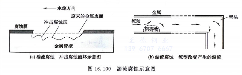 在某些特(te)定(ding)部(bu)位(wei),介質流(liu)(liu)(liu)速(su)急劇(ju)增大(da)形成(cheng)湍(tuan)流(liu)(liu)(liu),由(you)湍(tuan)流(liu)(liu)(liu)導致的(de)(de)(de)(de)磨蝕(shi)(shi),即為湍(tuan)流(liu)(liu)(liu)腐(fu)(fu)(fu)蝕(shi)(shi)。遭到湍(tuan)流(liu)(liu)(liu)腐(fu)(fu)(fu)蝕(shi)(shi)的(de)(de)(de)(de)金(jin)屬(shu)表面,常(chang)常(chang)呈現深(shen)谷(gu)或馬蹄形的(de)(de)(de)(de)凹槽,一般(ban)按流(liu)(liu)(liu)體(ti)的(de)(de)(de)(de)流(liu)(liu)(liu)動方(fang)向切(qie)入金(jin)屬(shu)表面層,蝕(shi)(shi)谷(gu)光(guang)滑沒(mei)有腐(fu)(fu)(fu)蝕(shi)(shi)產物(wu)積存。構成(cheng)湍(tuan)流(liu)(liu)(liu)腐(fu)(fu)(fu)蝕(shi)(shi)除(chu)流(liu)(liu)(liu)體(ti)速(su)度(du)較大(da)外,構件形狀的(de)(de)(de)(de)不規(gui)則性也是引(yin)起湍(tuan)流(liu)(liu)(liu)的(de)(de)(de)(de)一個重要條件。在輸送流(liu)(liu)(liu)體(ti)的(de)(de)(de)(de)管(guan)道(dao)內,流(liu)(liu)(liu)體(ti)按水平或垂直方(fang)向運(yun)動時,管(guan)壁(bi)(bi)的(de)(de)(de)(de)腐(fu)(fu)(fu)蝕(shi)(shi)是均勻減(jian)薄(bo)的(de)(de)(de)(de)。但對于(yu)流(liu)(liu)(liu)體(ti)突(tu)然改向處,如彎管(guan)、U形換熱管(guan)等的(de)(de)(de)(de)拐彎部(bu)位(wei),其(qi)管(guan)壁(bi)(bi)就要比(bi)其(qi)他(ta)部(bu)位(wei)的(de)(de)(de)(de)管(guan)壁(bi)(bi)迅(xun)速(su)減(jian)薄(bo)甚至穿洞。