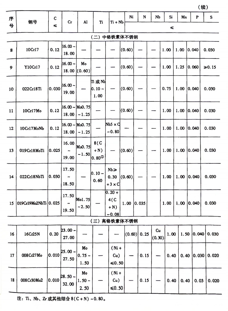 鐵素體不銹鋼的鉻含量(質量分數)一般在11%~30%,碳含量(質量分數)大多低于0.12%。一般按鋼中鉻含量的不同可分為:低鉻鐵素體不銹鋼(Cr)=11%~15%~15%、中鉻鐵素體不銹鋼(Cr)=16%~20%% 和高鉻鐵素體不銹鋼(Cr)=26%~30%%,其分類和化學成分見表6-1。
